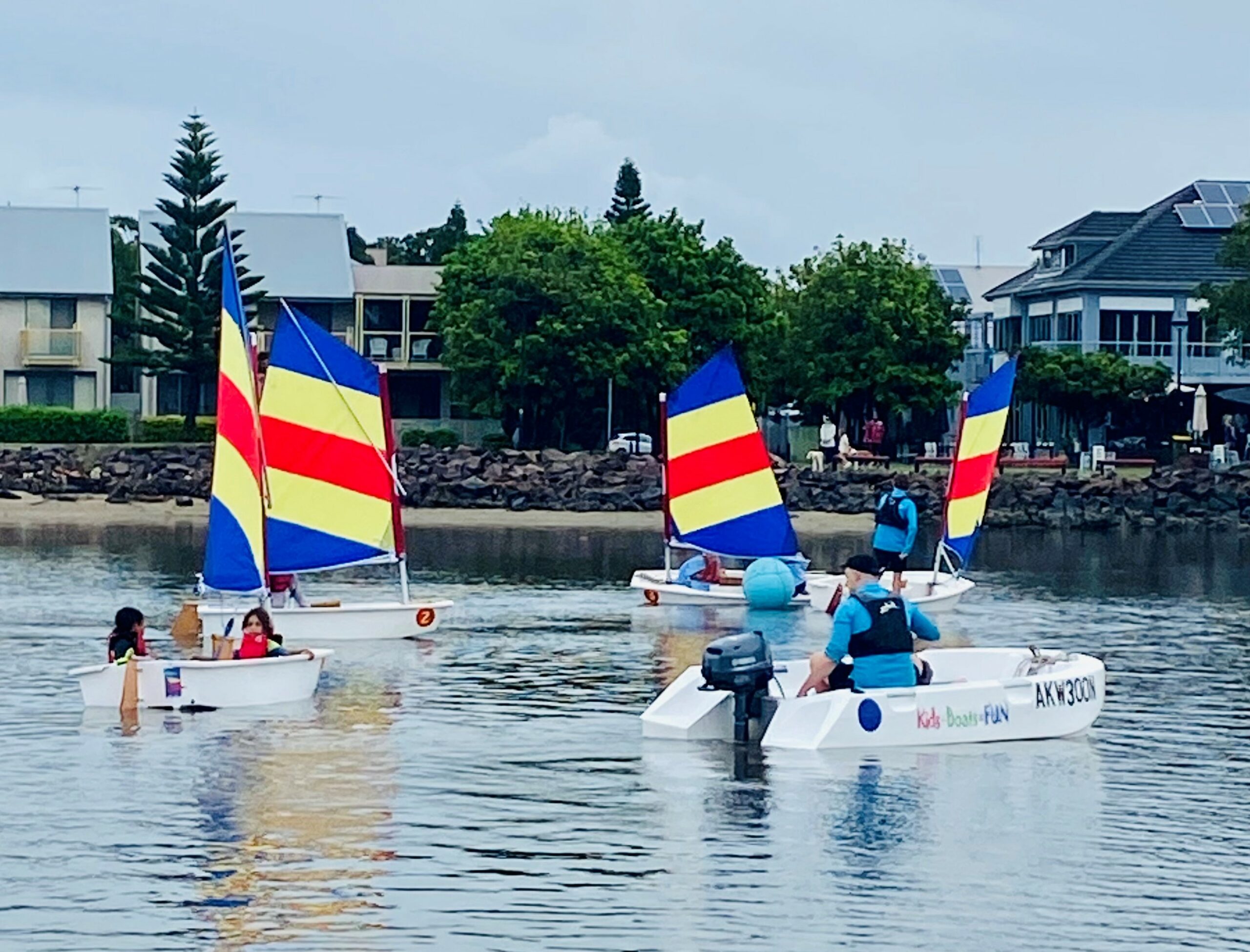 We sail on the sheltered waters of ‘The Basin” in Newcastle Harbour, just in front of Honeysuckle Hotel. A fantastic spot, close to the shore where parents and friends can easily observe the kids on-water.